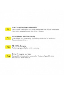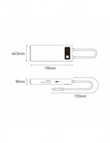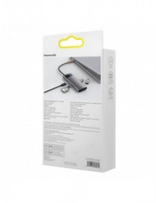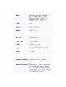 Specifikation: Märke: Baseus Typ: Dockningsstation (HUB) Material: Aluminium Ingång: USB Type-C Spänning: 5V/3A, 9V/3A, 15V/3A, 20V/5A USB 3.0-port (max 5Gbit/s): 3x SD / TF-kortplats (max 104 Mbit/s): 1x / 1x Snabbladdningsuttag (max 100W): 1x De viktigaste funktionerna: Intressant design 6-i-1-enhet Stöd för snabbladdning Överhettningsskydd