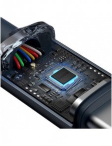 Det flätade höljet till USB Type C - USB Type C Baseus Crystal Shine Series-kabel med en hållbar textur har ytterligare förstärkning på platsen där kontakten ansluts till kabeln. Den är därför motståndskraftig mot böjning och sträckning. Inuti finns en 8-tråds kopparkabel, som tack vare det intelligenta chippet inte värms upp ens vid samtidig laddning och dataöverföring.